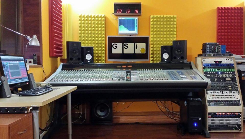 esattamente nella posizione in cui è stata scattata la foto c'è una scrivania Ikea primi anni 2000 con due ripiani, che accoglie il pc e i monitor Adam A7X per il mix.